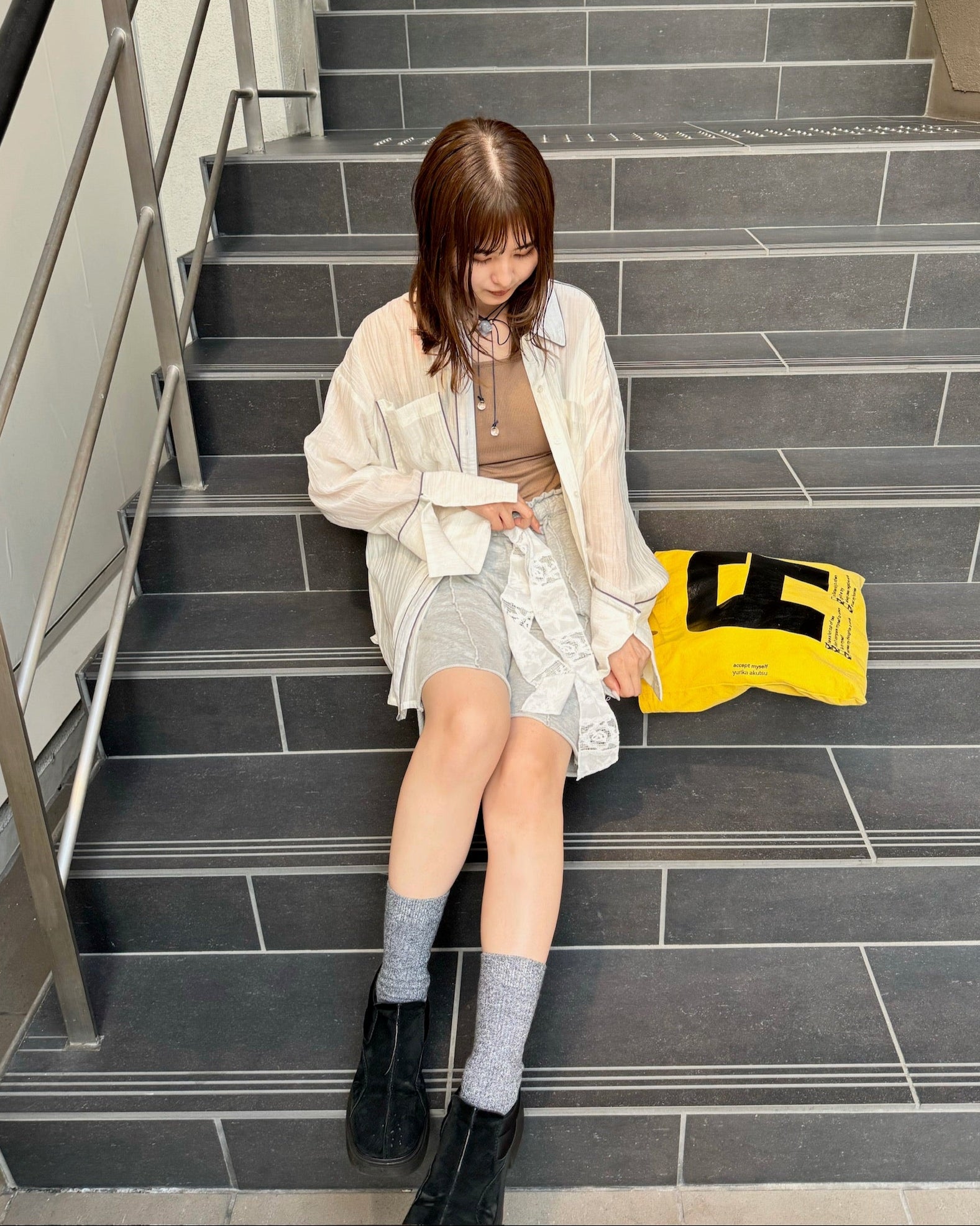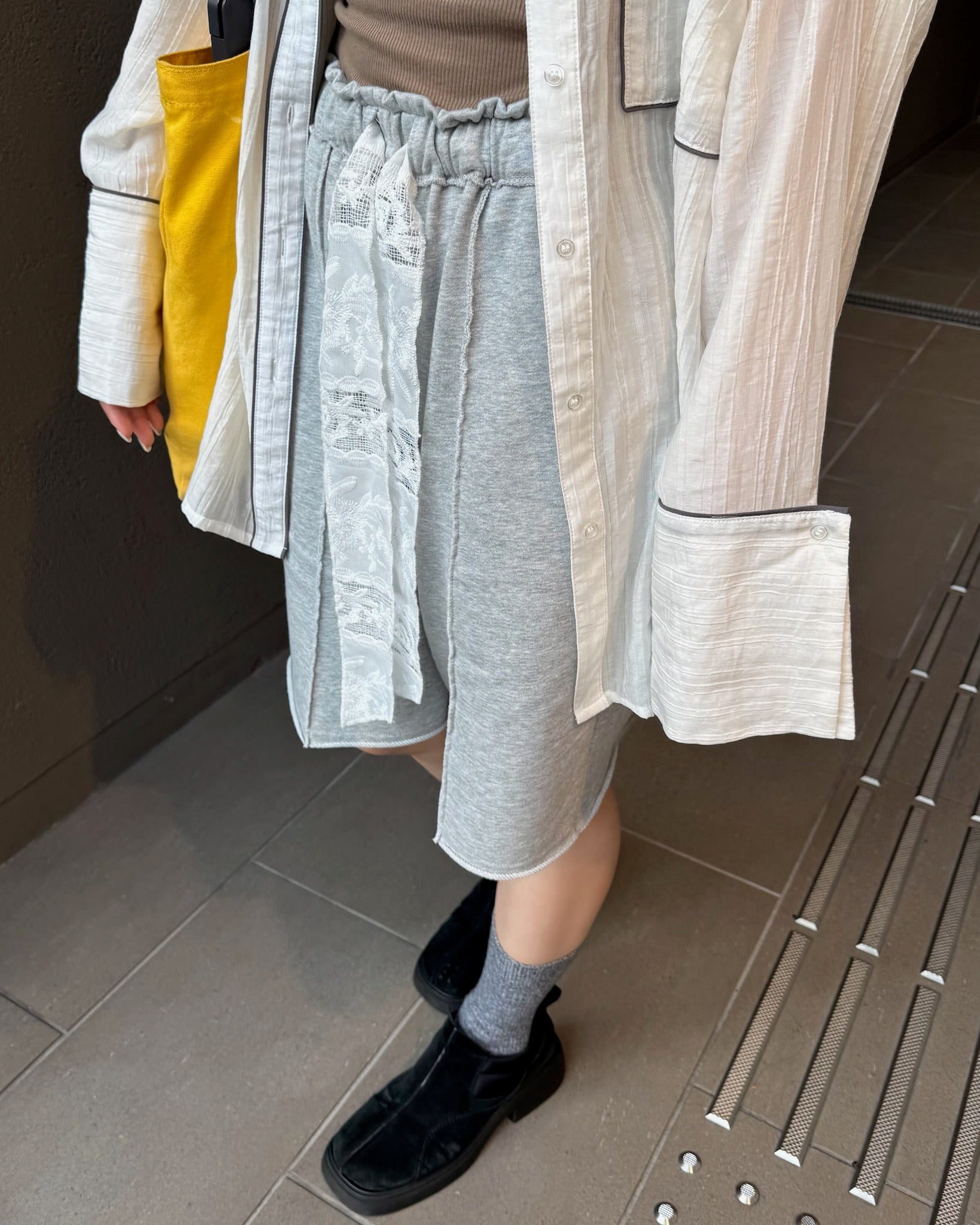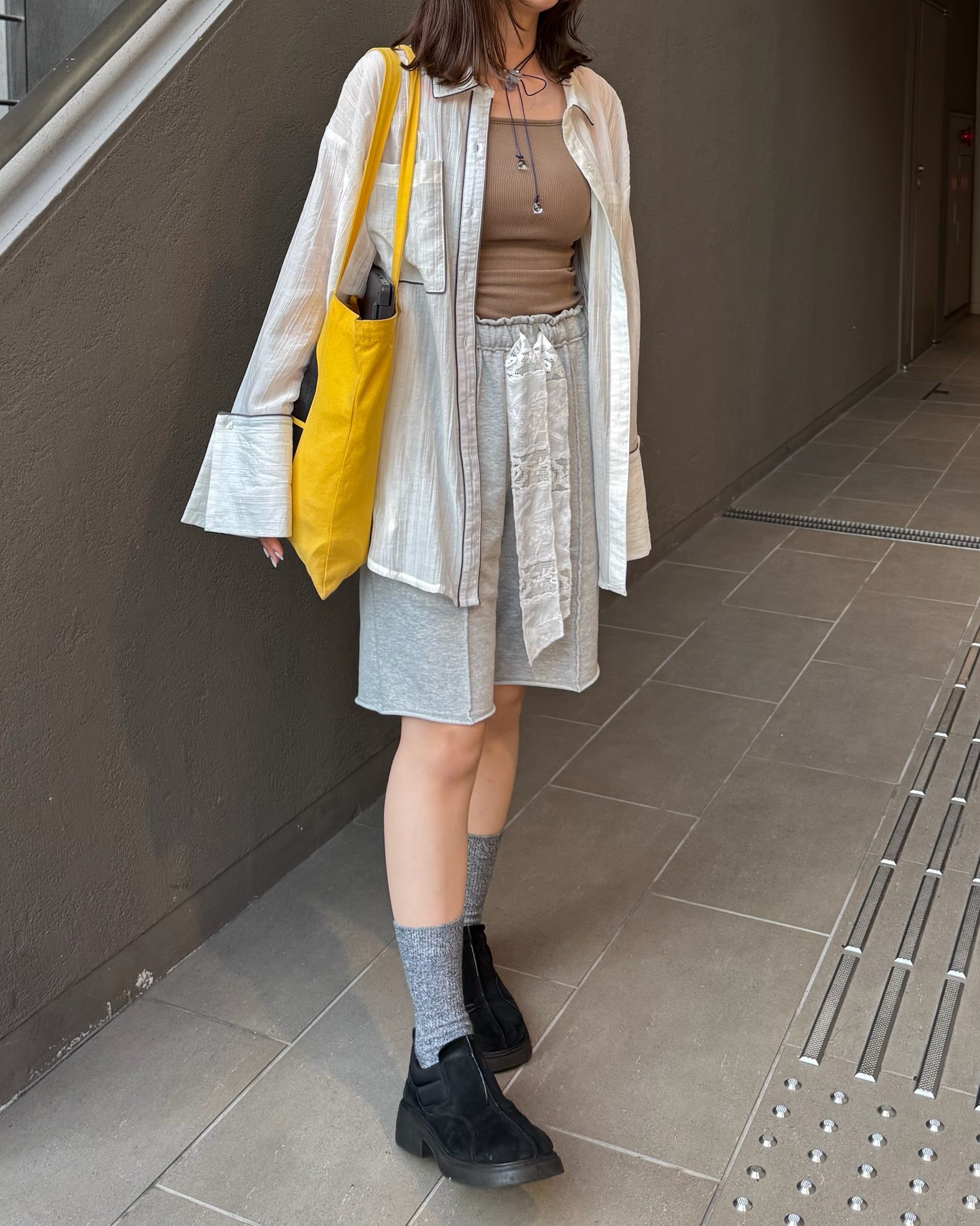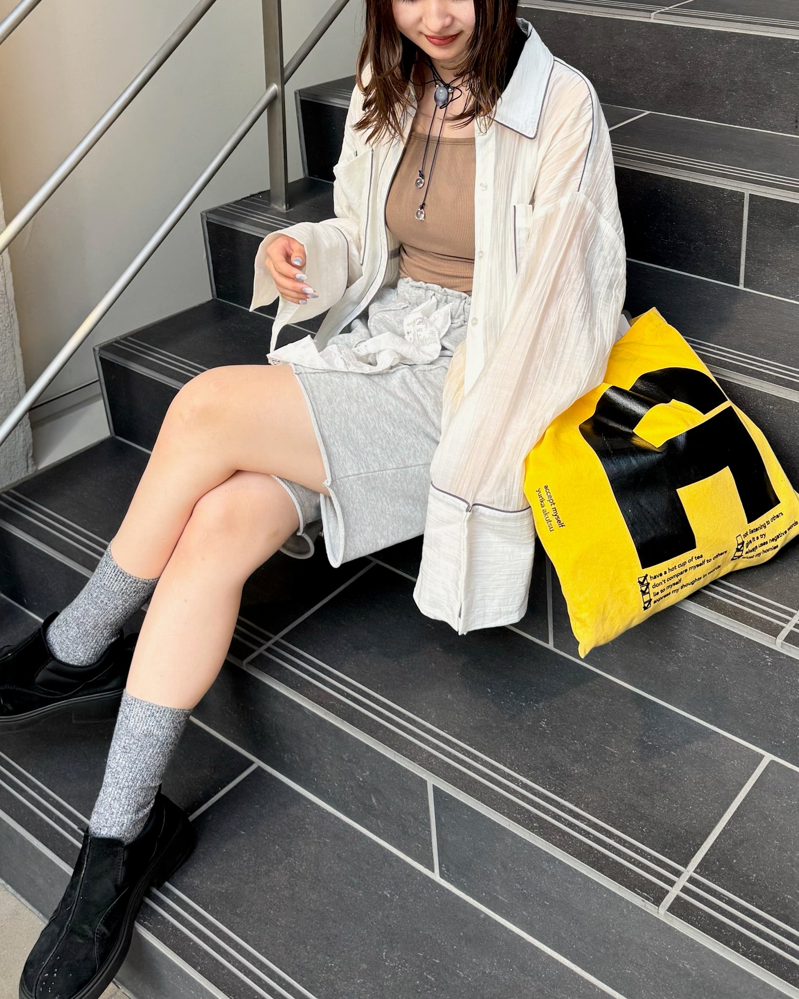 シアートップス×スウェットパンツの異素材ミックスコーデ。 小物をブラックでまとめることで、ラフさの中にもメリハリの利いたスタイリングに。