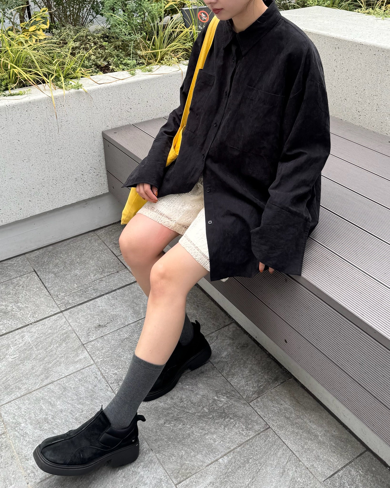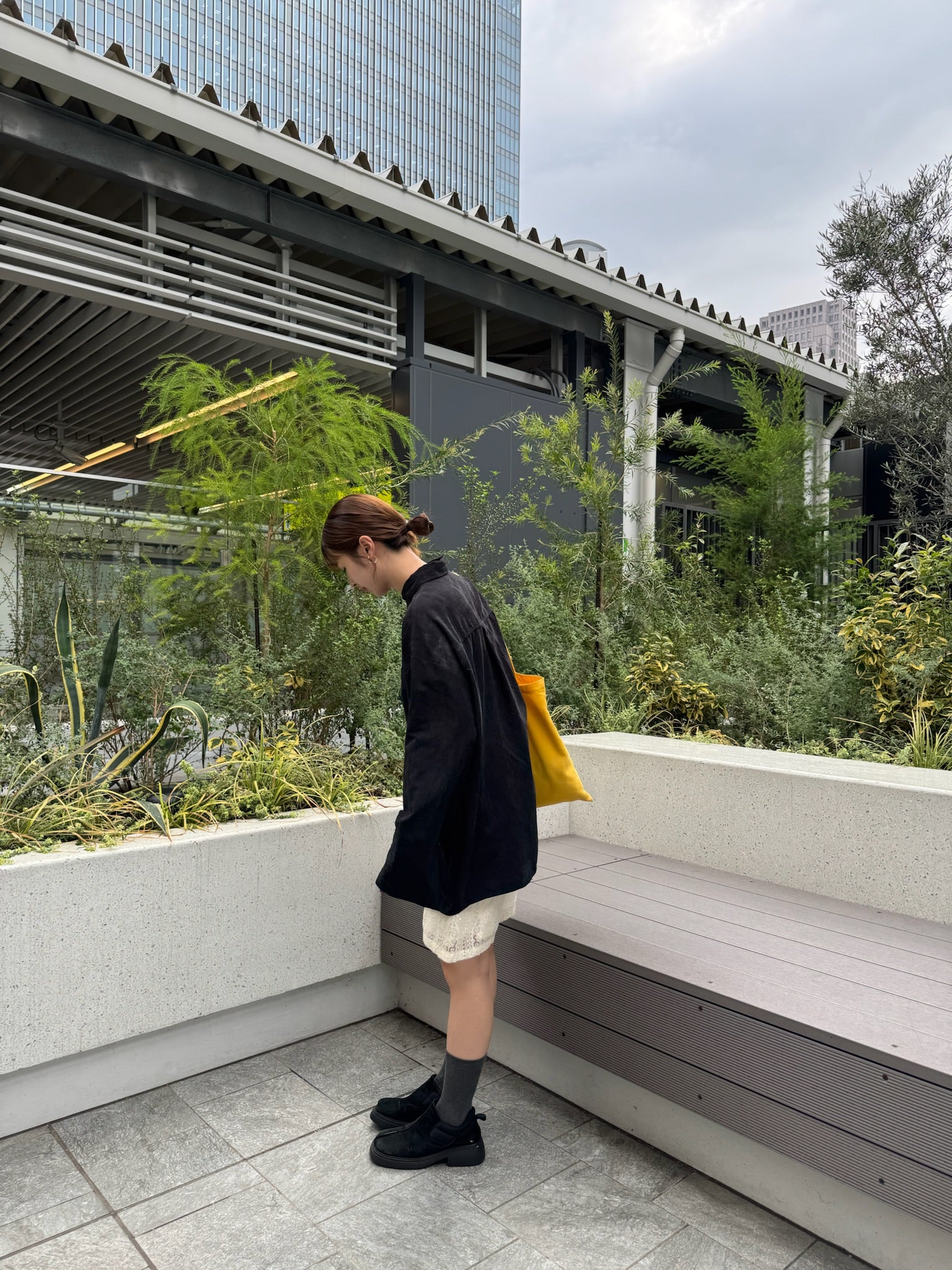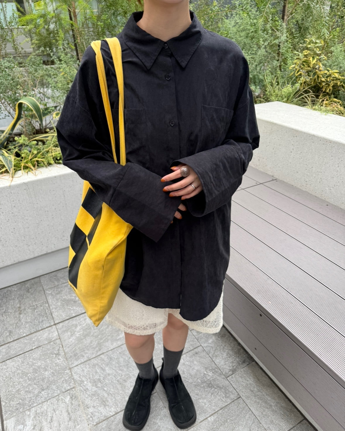 オールブラックコーデ。 ハリ感のあるシャツ生地にサテン生地のスカートを合わせることで ブラック同士でも重たくなりすぎないスタイリングに仕上がります。