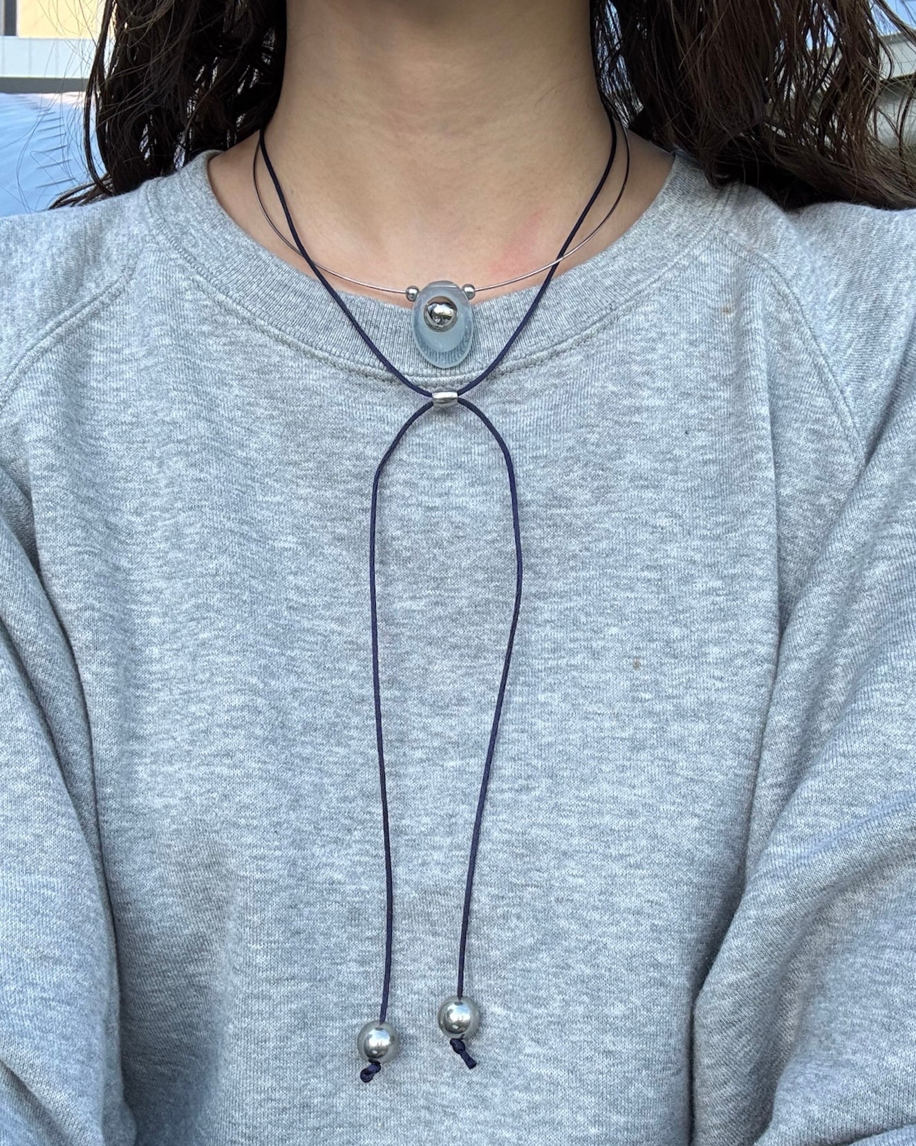 サテンコードとシルバーの2連デザインが目を惹くネックレス。