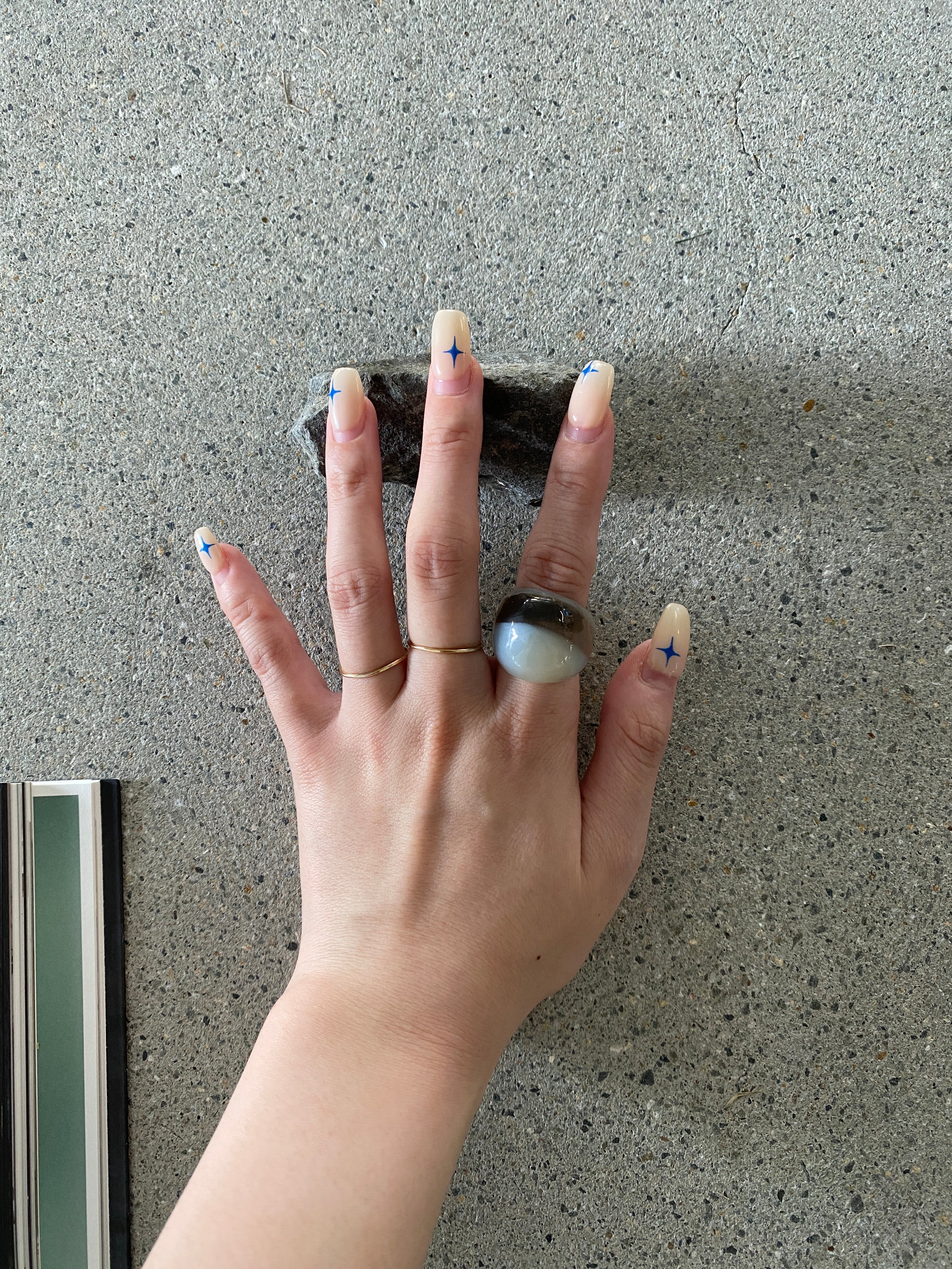 シンプルで手元に馴染みやすいカラーでありながらも程よい個性が光るリング。